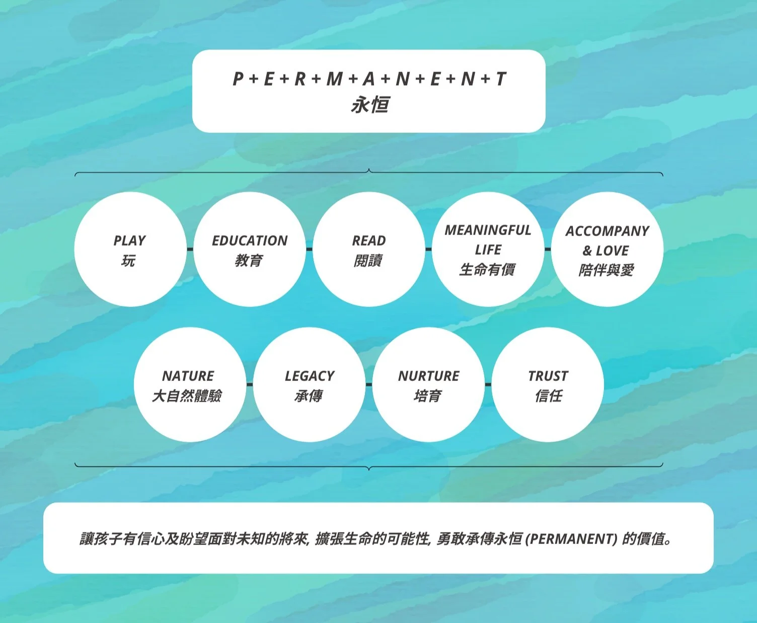 透過書本、繪本、桌遊、大自然體驗、分享服待、交流等活動,EMPOWER (充權) 下一代及不同的對象,讓他們有信心及盼望面對未知的將來,擴張生命的可能性,勇敢承傳永恒 (PERMANENT) 的價值。